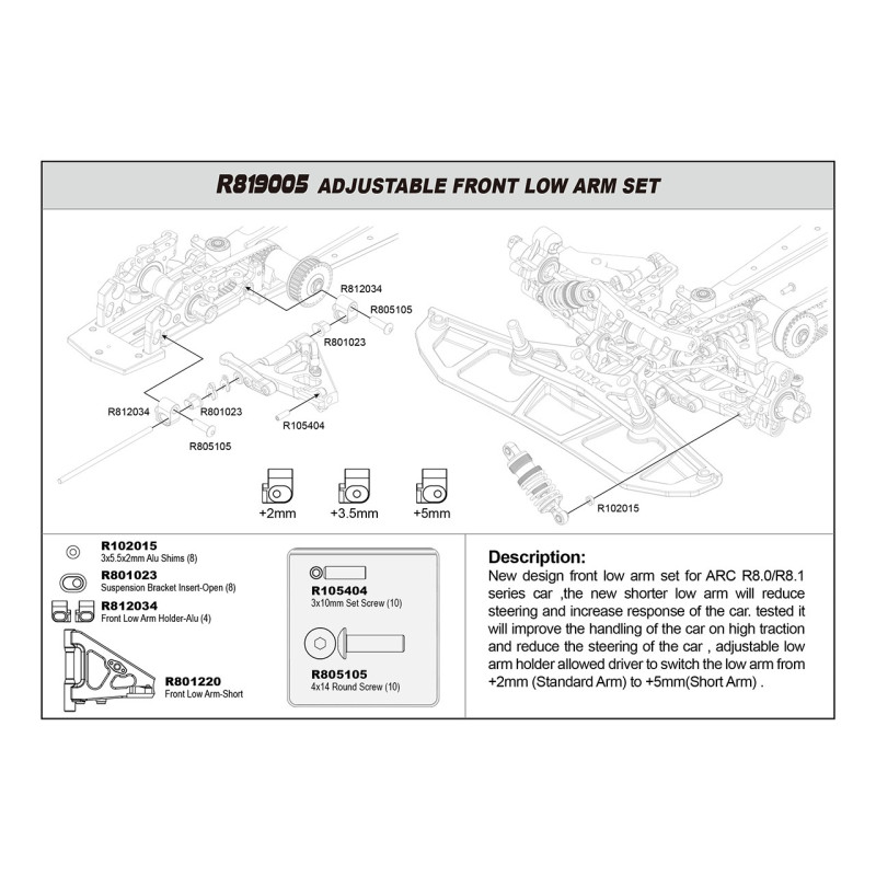 New design front low arm set for ARC.1 series car ,the new shorter low arm will reduce steering and increase response of the car. tested it will improve the handling of the car on high traction and reduce the steering of the car , adjustable low arm holder allowed driver to switch the low arm from +2mm (Standard Arm) to +5mm(Short Arm)